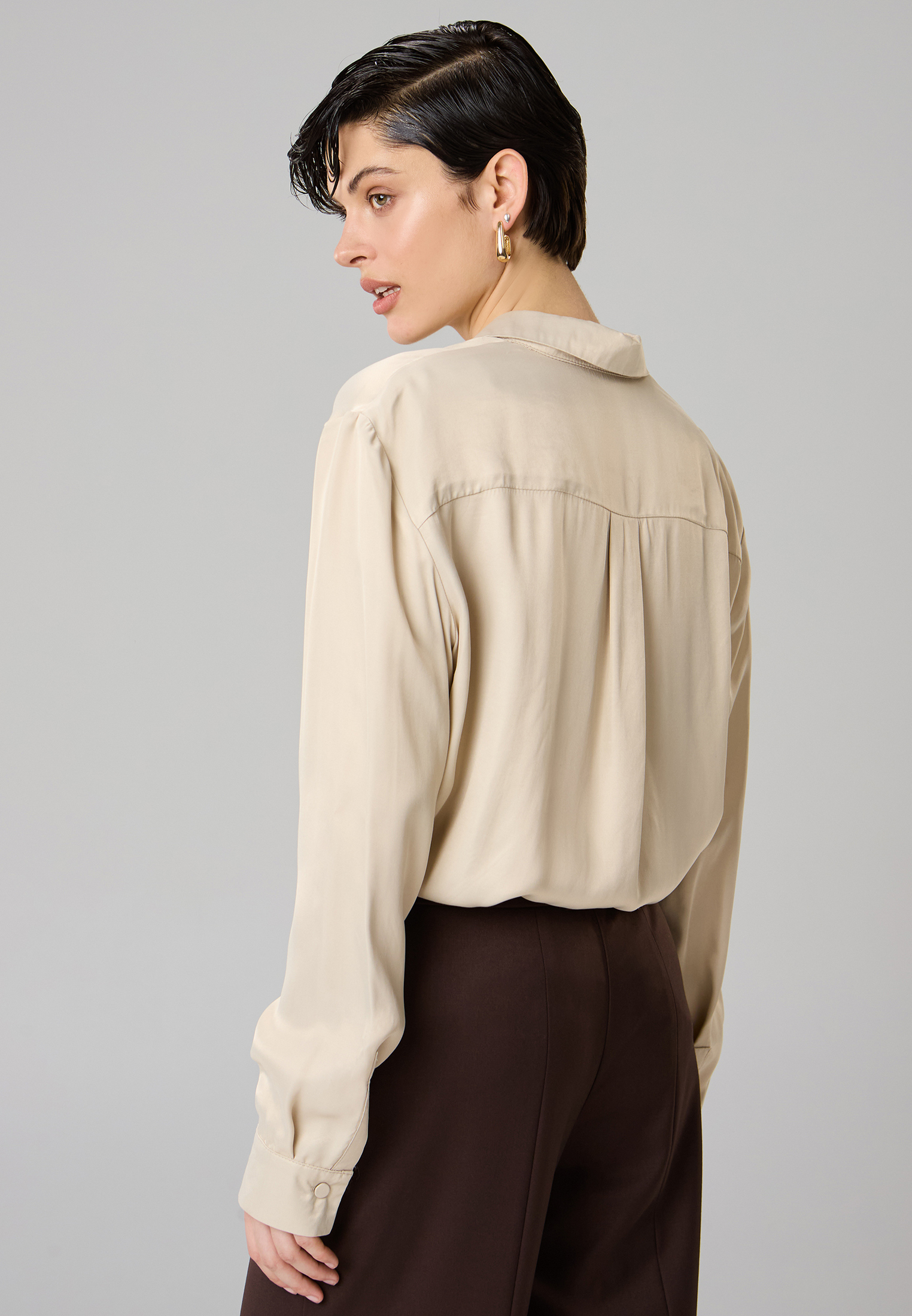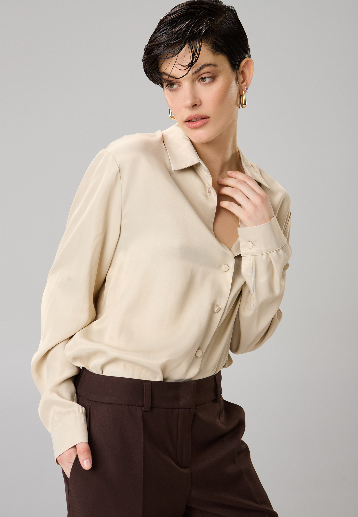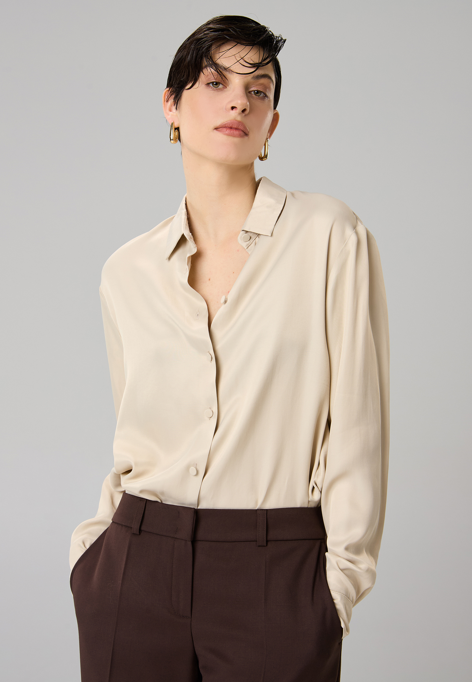 Блузка прямого силуэта из лёгкой мерцающей вискозы с классическим сорочечным воротником на отрезной стойке и центральной застёжкой на пуговицы.