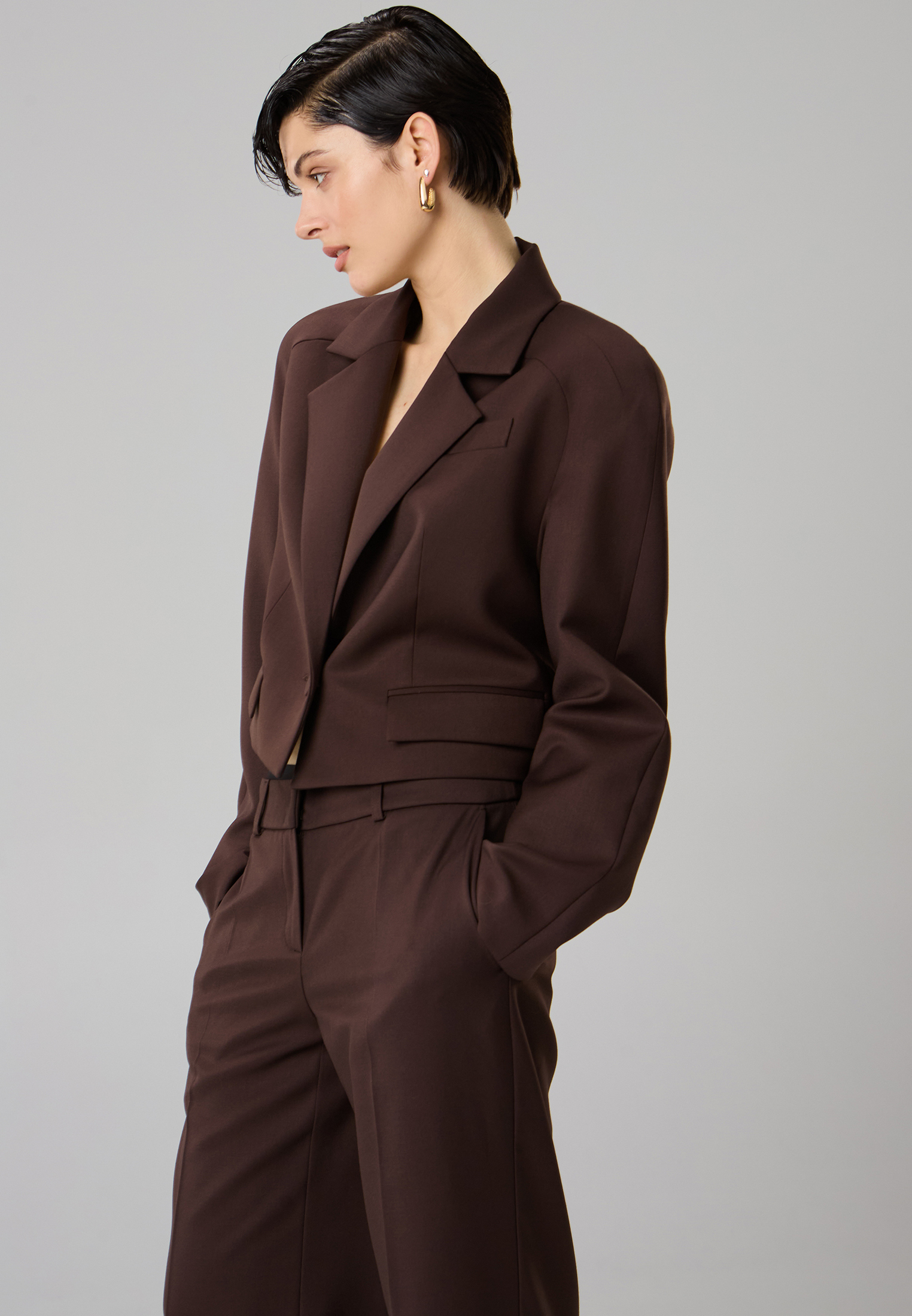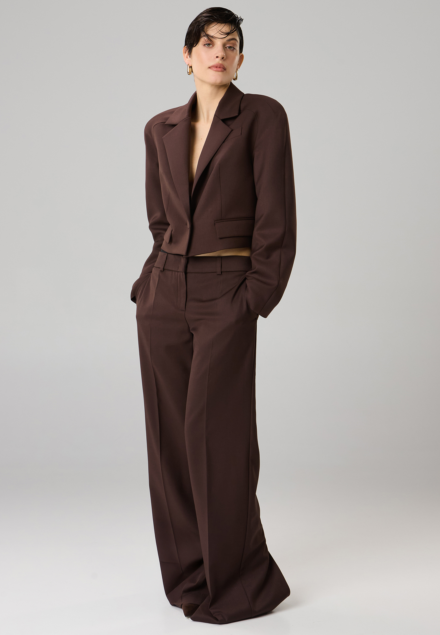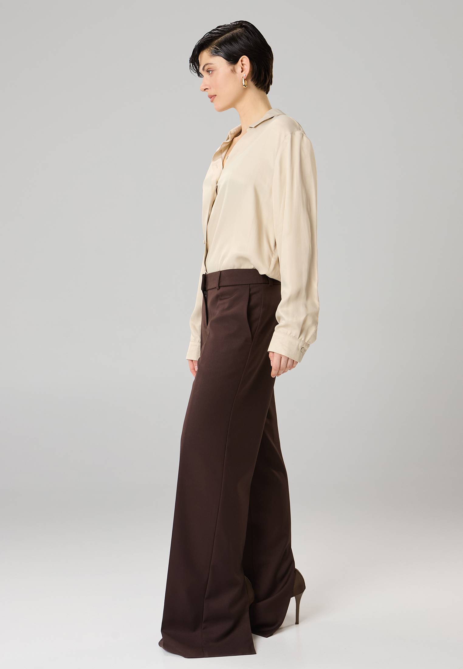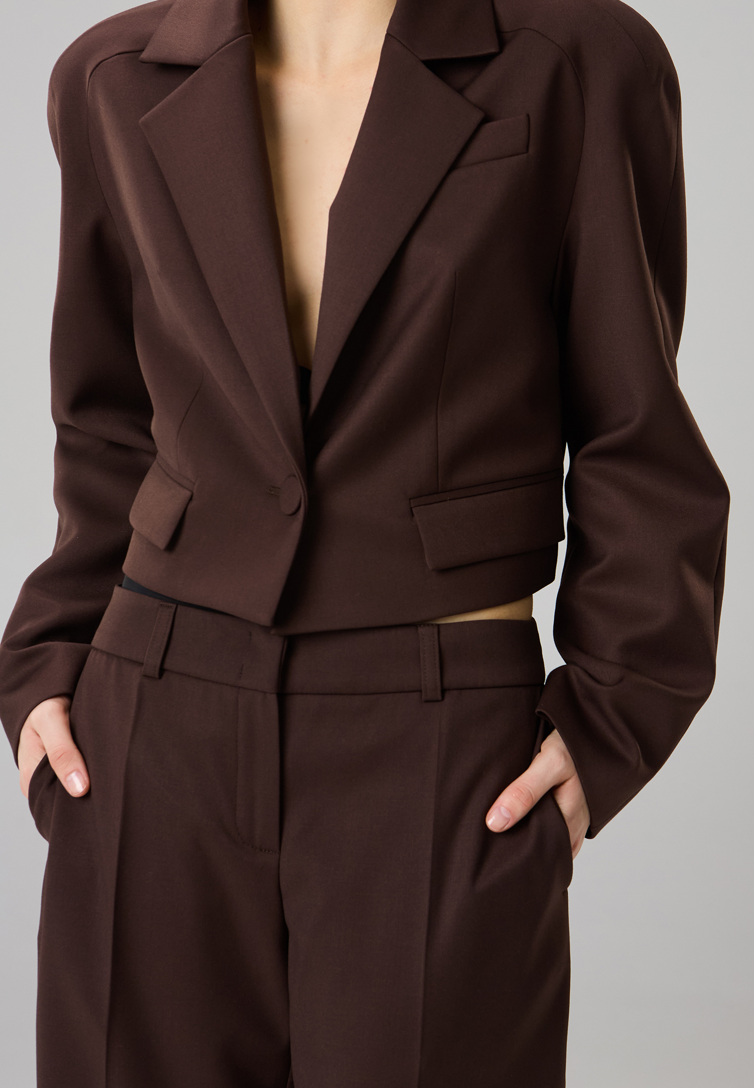 Прямые брюки с посадкой на бедрах и отрезным поясом. Модель с боковыми карманами и заутюженными стрелками. Спинка оформлена вертикальными рельефными швами с разрезами по низу изделия. Брюки полностью на подкладке (отлетной по нижнему краю), что обеспечивает премиальное качество и износостойкость.