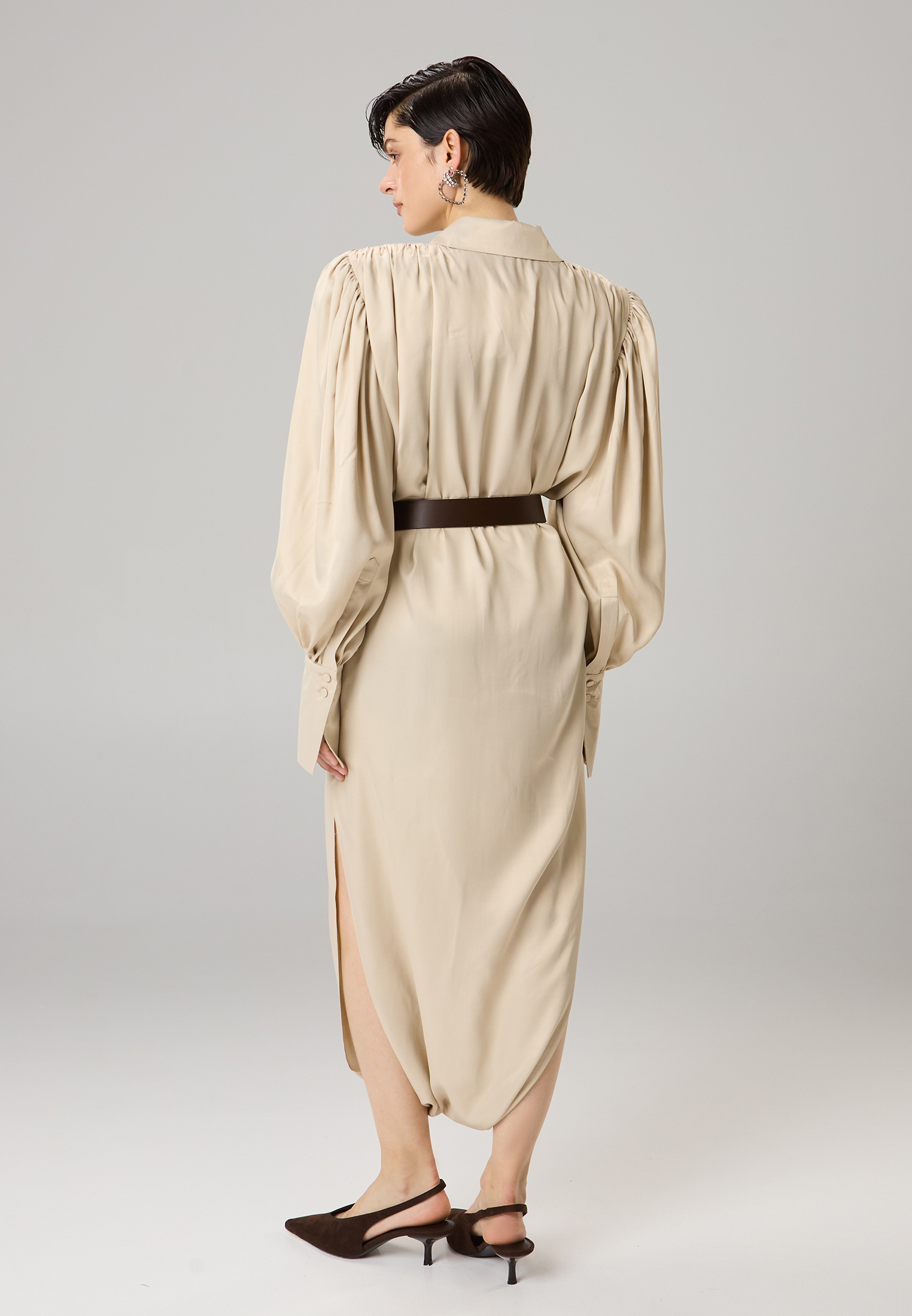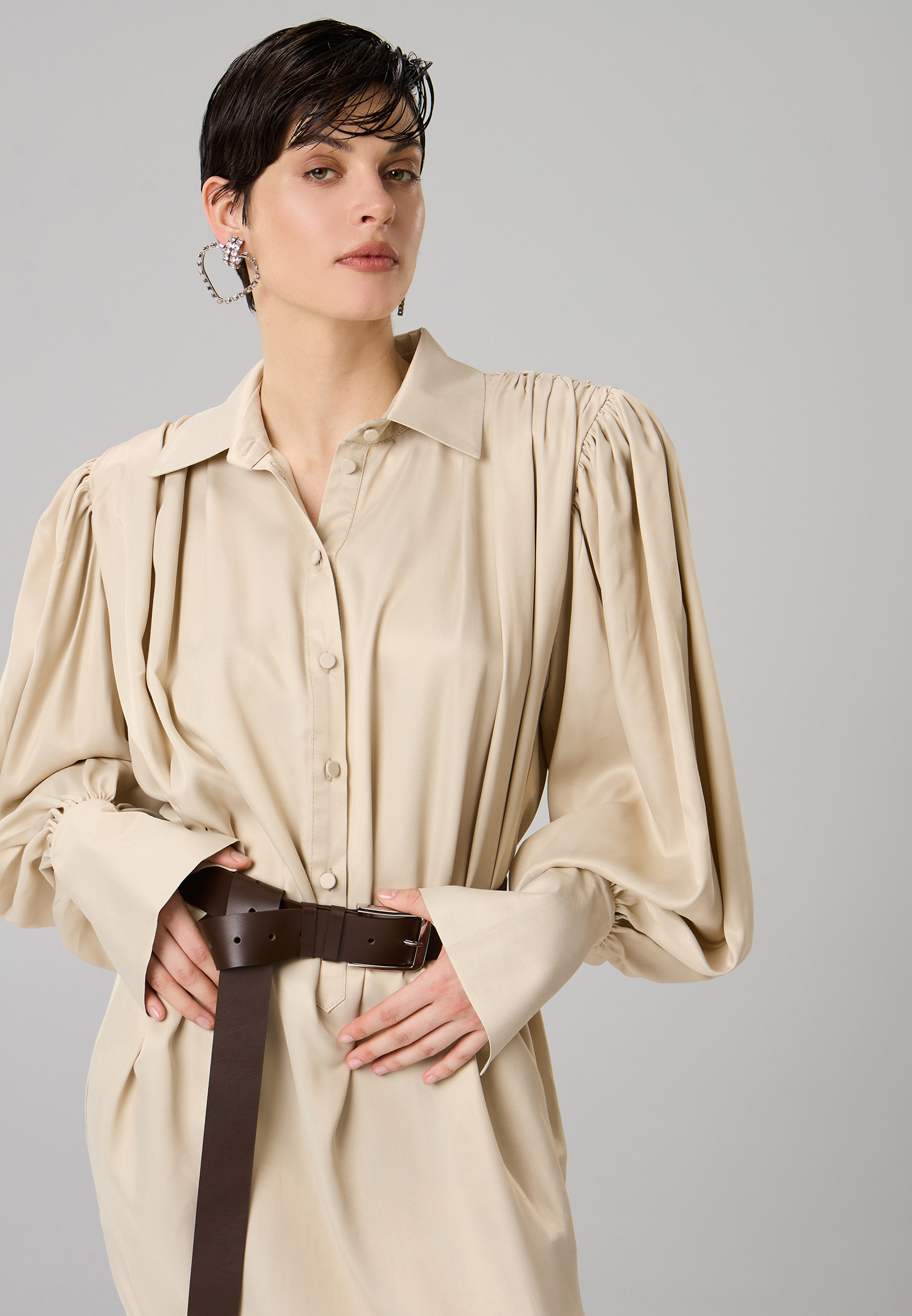 Перед — со сборкой по плечевым швам, с центральной застёжкой на четыре петли и пуговицы и одну петлю и пуговицу на стойке воротника; пуговицы обтянуты основной тканью. Рукава рубашечного типа, одношовные, с выразительной сборкой в верхней части оката и притачными высокими манжетами, застёгивающимися на две петли и пуговицы. По швам притачивания манжет срез рукава присборен, а разрезы обработаны английской планкой.