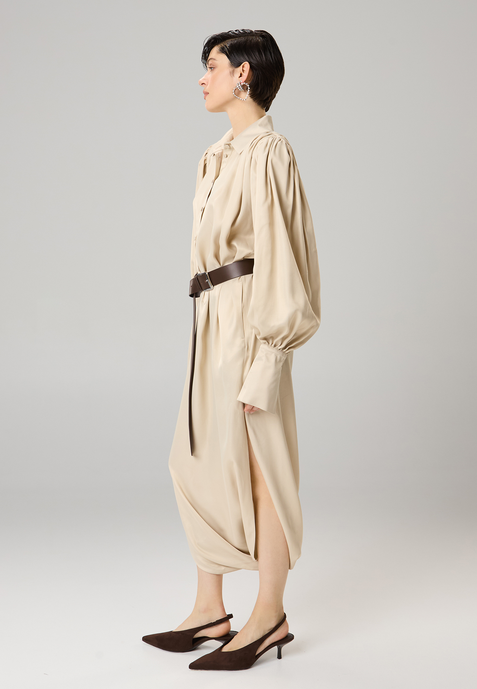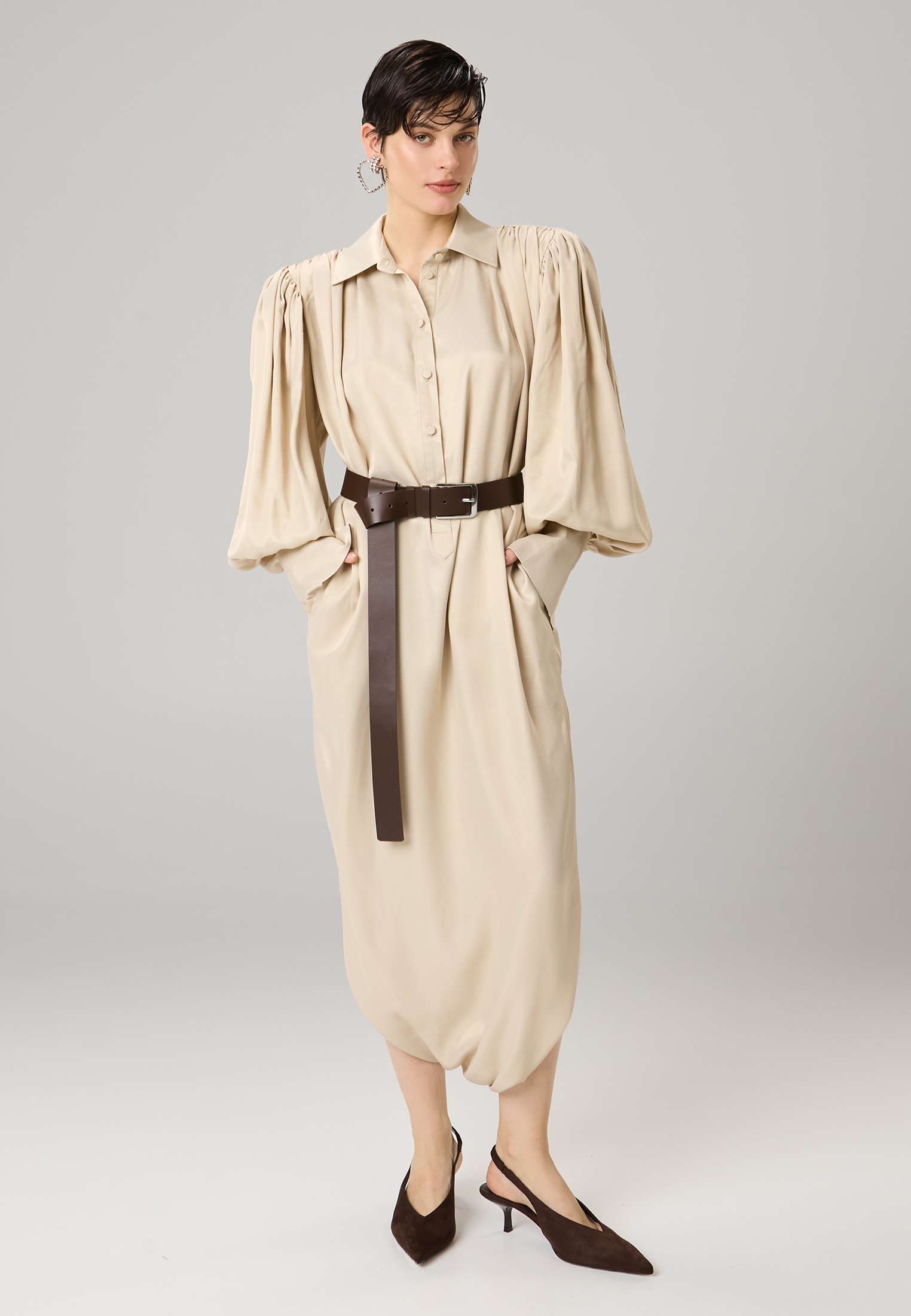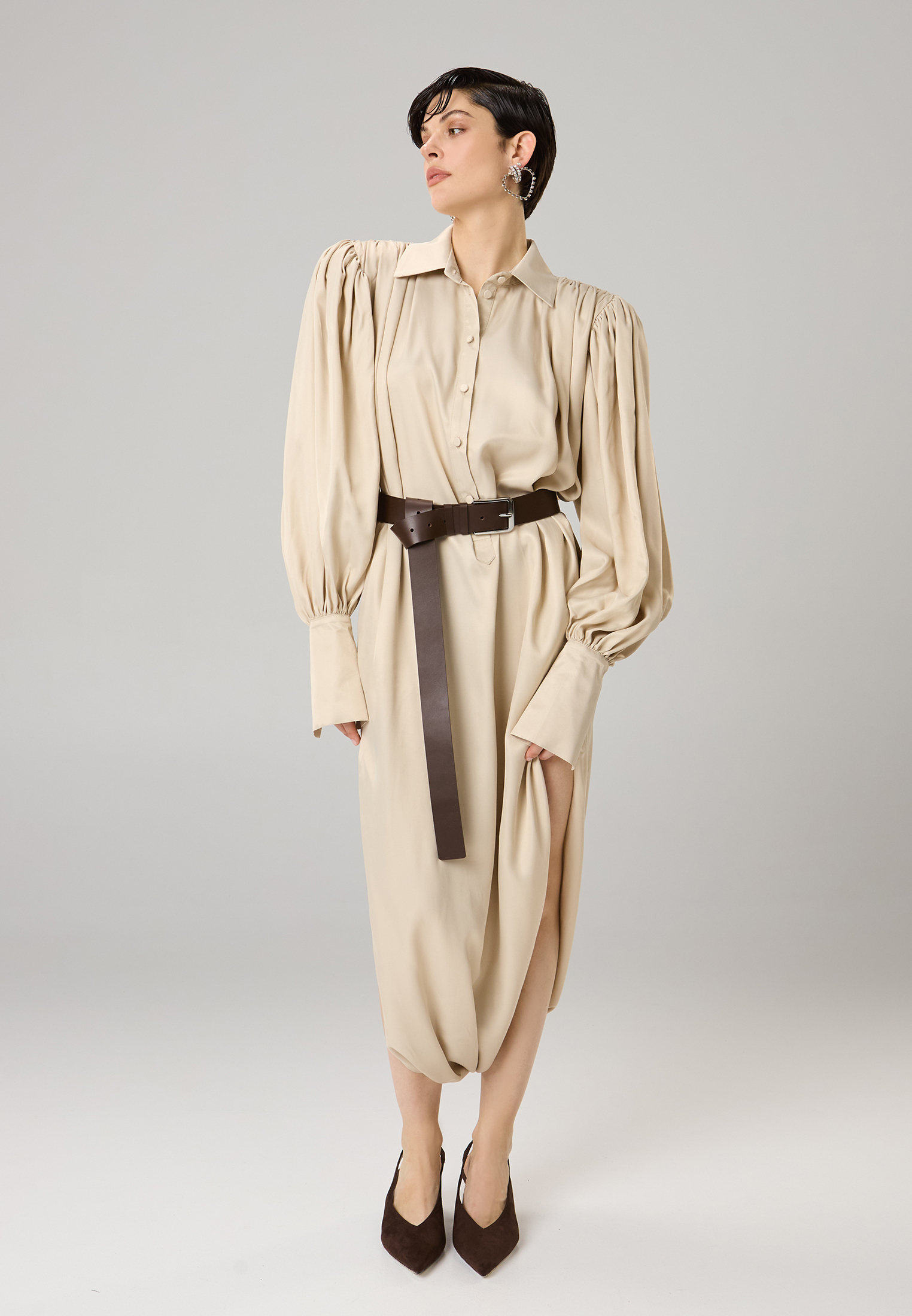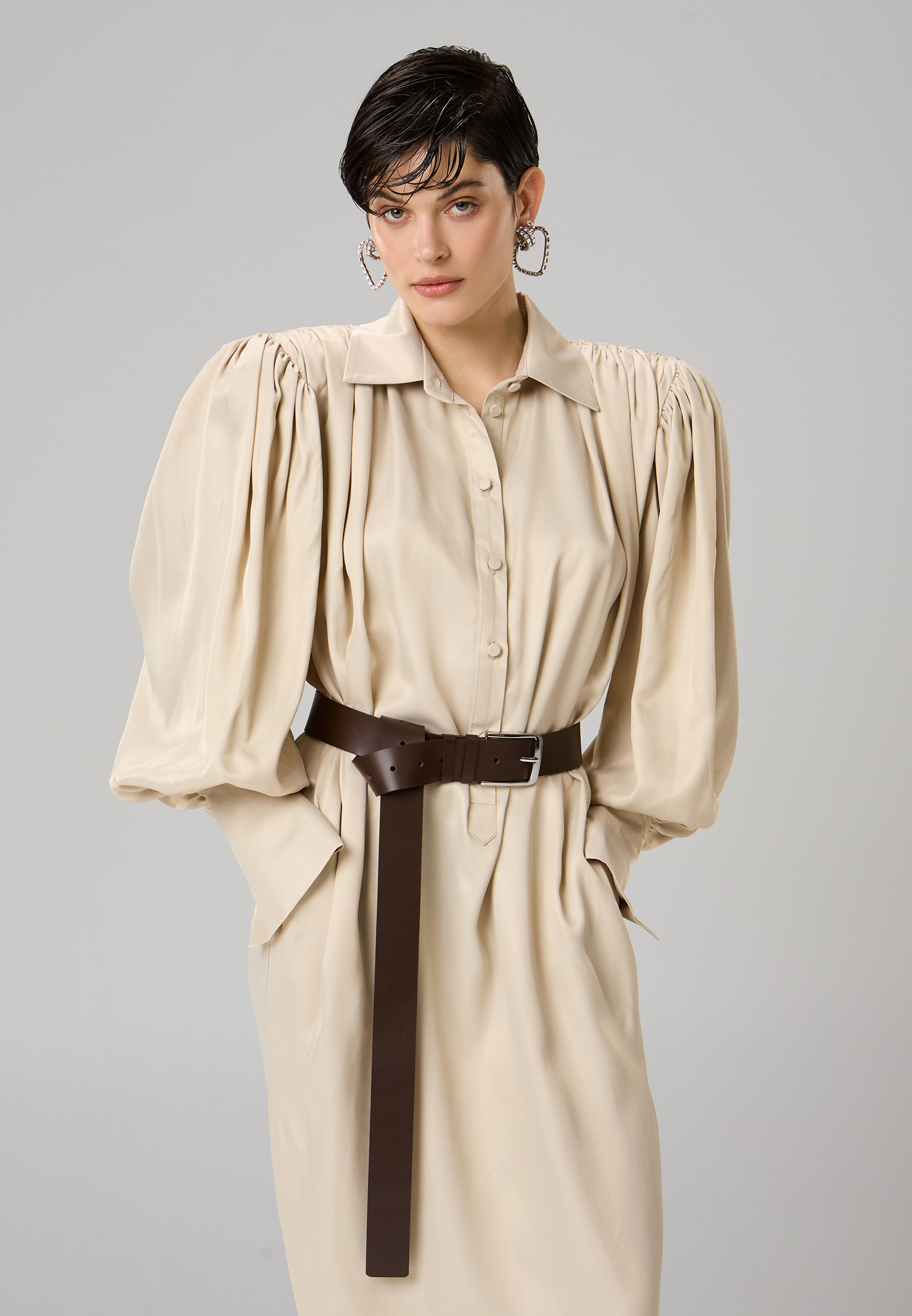 Платье с ремнем из натуральной кожи, что позволяет создавать новые образы и акцентировать талию; с карманами в боковых швах — на уровне линии бёдер; плечевые накладки обтянуты подкладочной тканью.